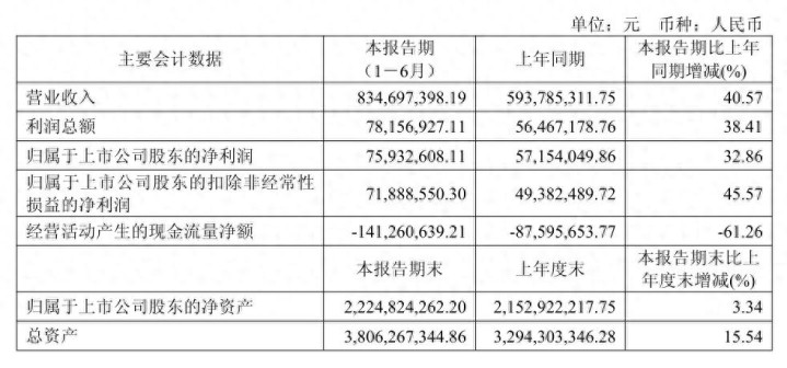 2025年1至6月份,金帝股份营业收入8.35亿元,同比增长40.57%,归属于上市公司股东的净利润7593.26万元,同比增长32.86%,归属于上市公司股东的扣除非经常性损益的净利润7188.86万元,同比增长45.57%。